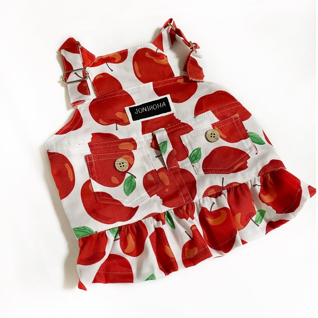 【クール無し】でかりんご♡お洒落なオーバーオールワンピ♡ オフホワイト フルーツ柄 りんご柄 犬服 犬服ハンドメイド 小型犬服 フレンチブルドッグ服 フレブル服 パグ服 犬服オーダーメイド