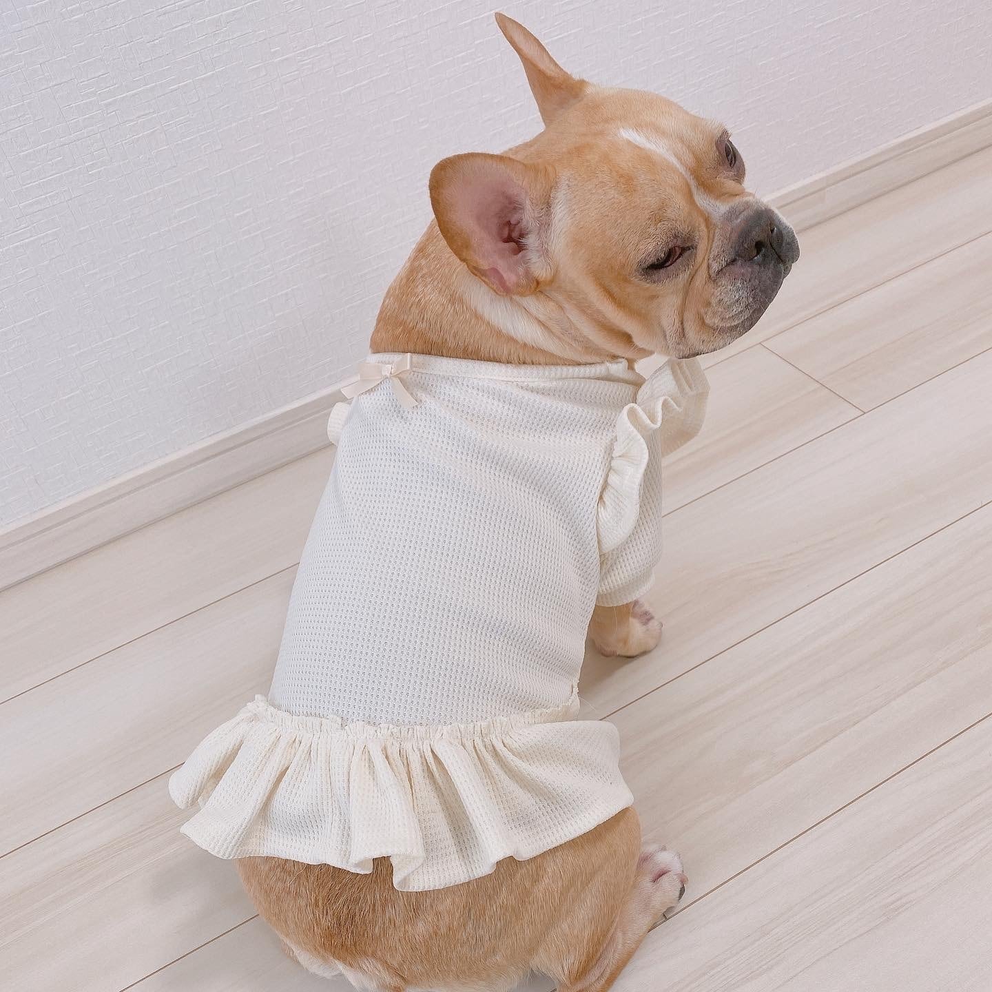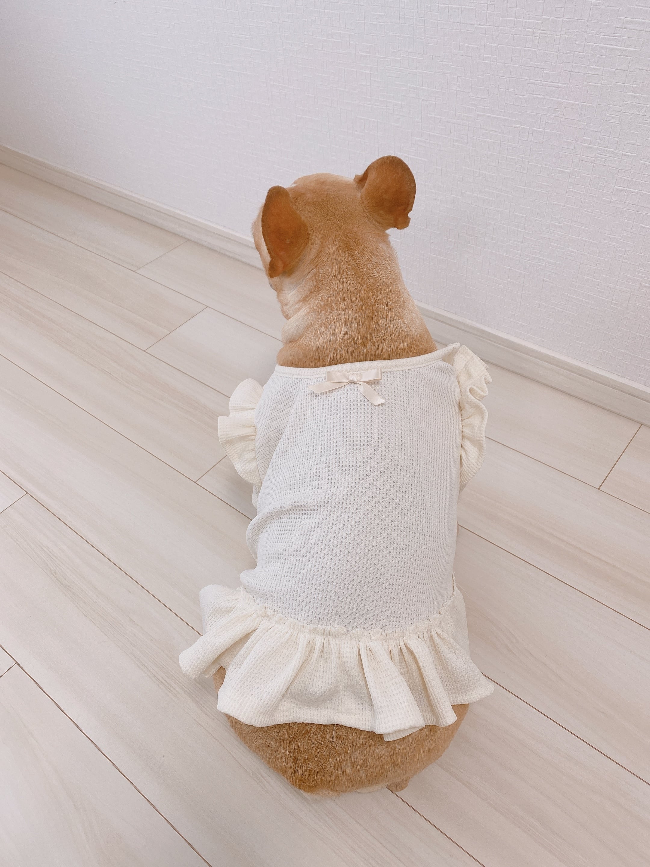 ふりふり♡ワッフルワンピース❤️ バニラホワイト くすみグリーン、くすみピンク 犬服 犬服ハンドメイド 犬服手作り フレンチブルドッグ服 フレブル服 パグ服 小型犬服