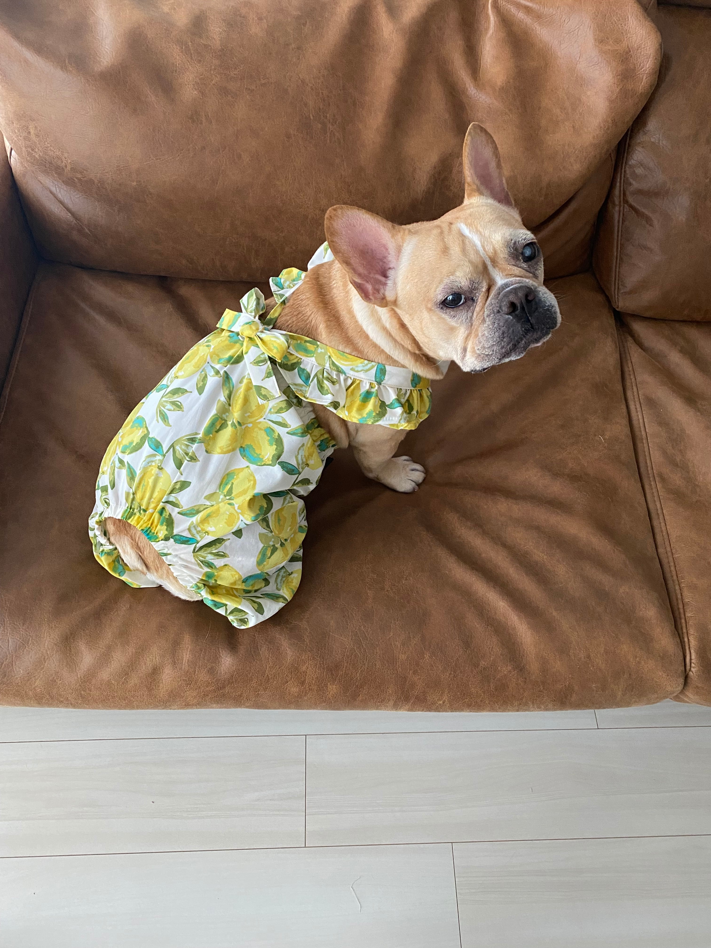 【クール無し】リゾートフルーツのカボチャパンツ❤️ リゾートレモン リゾートオレンジ 犬服 犬服ハンドメイド サロペット フルーツ柄 フレンチブルドッグ服 パグ服 小型犬服 プレゼント