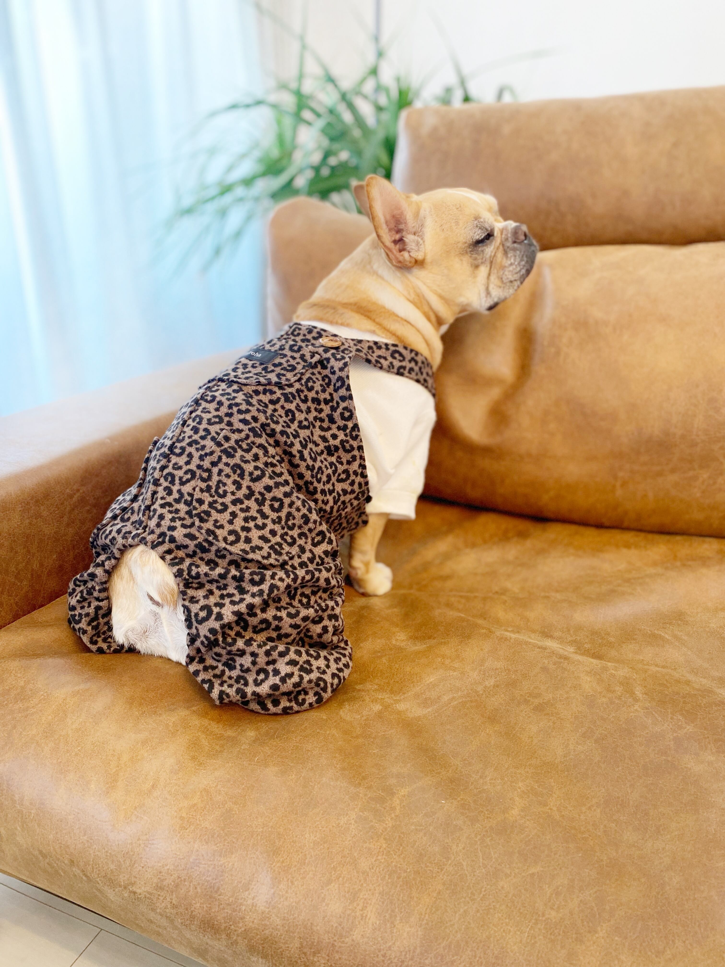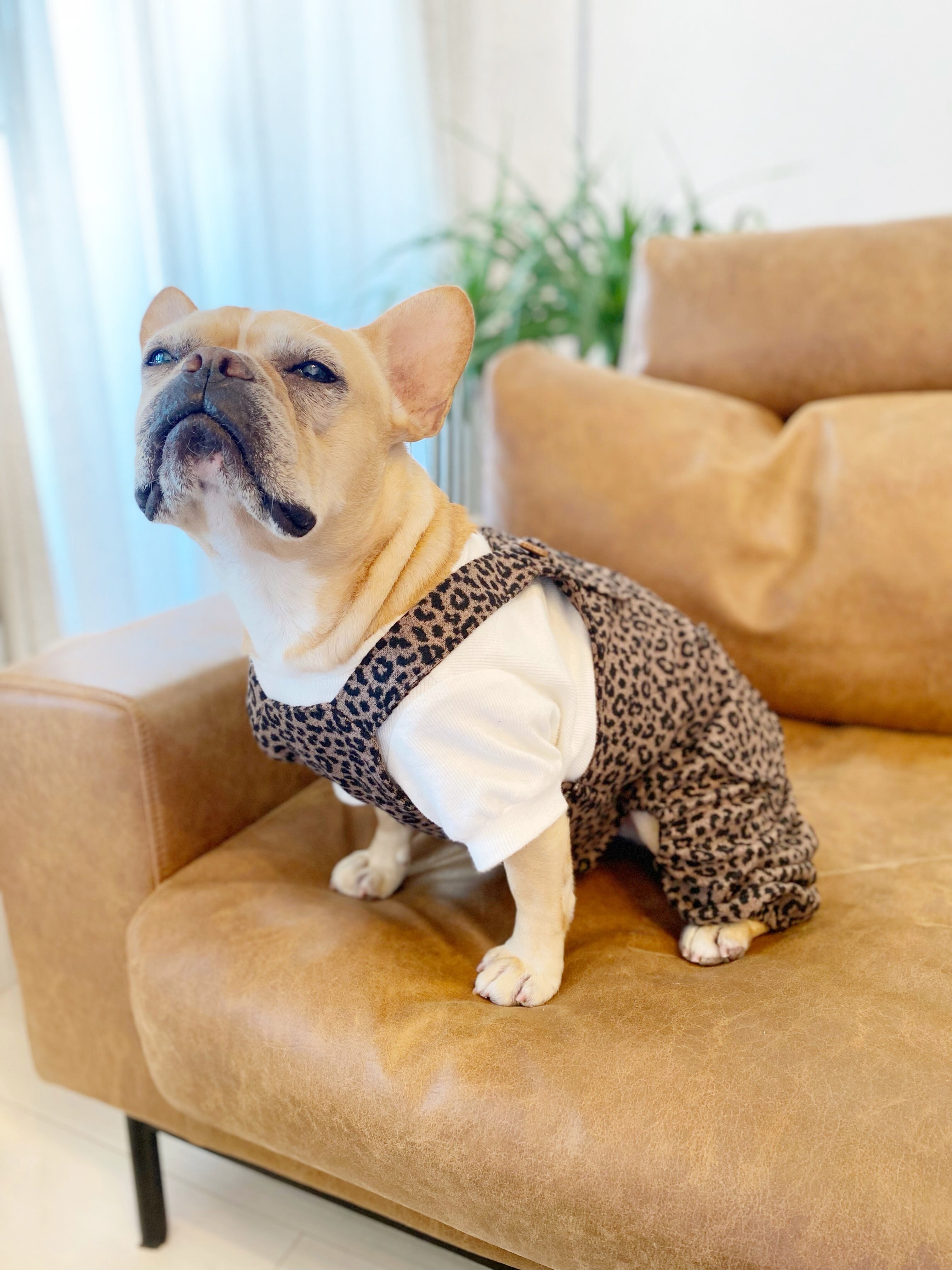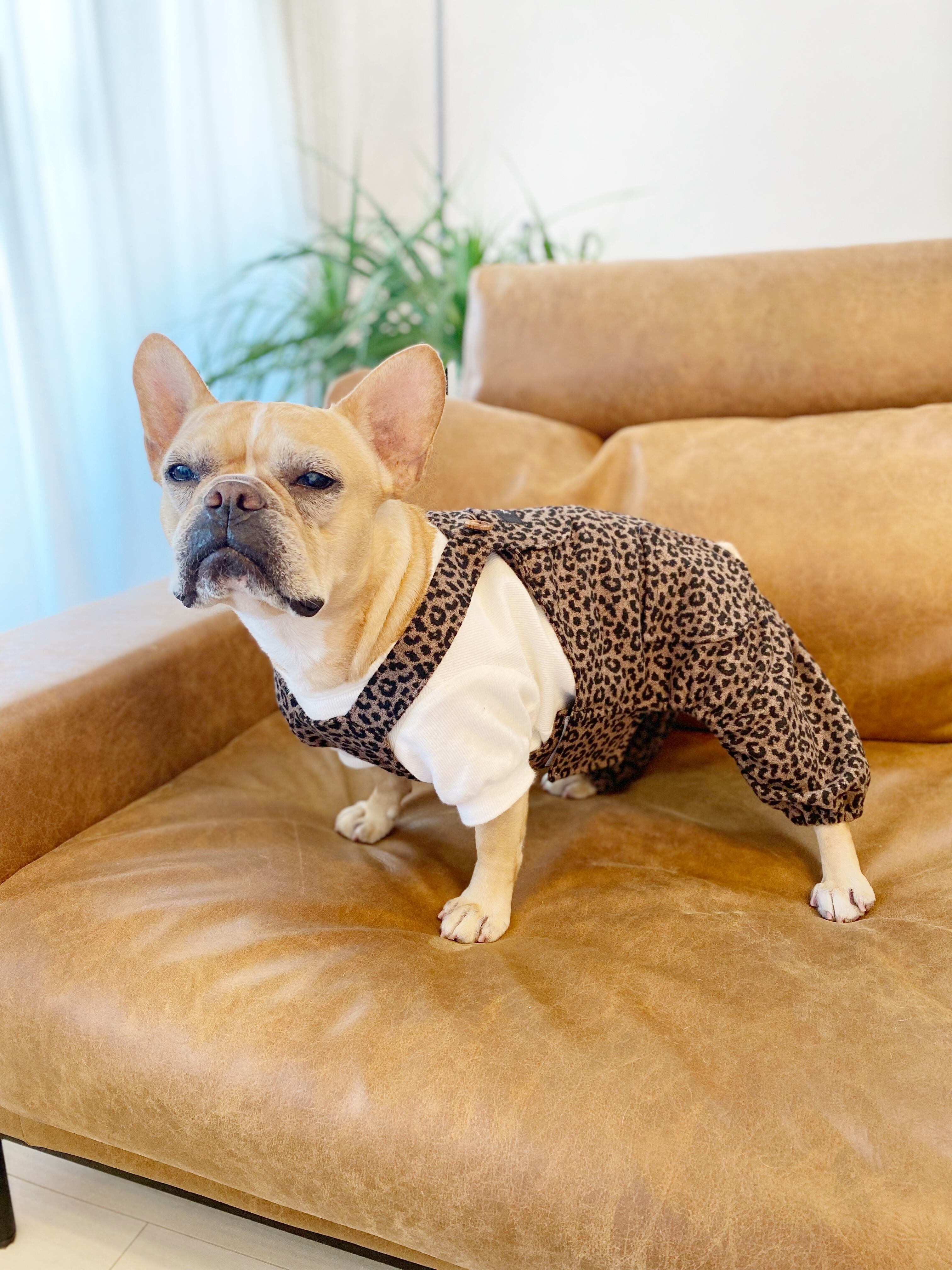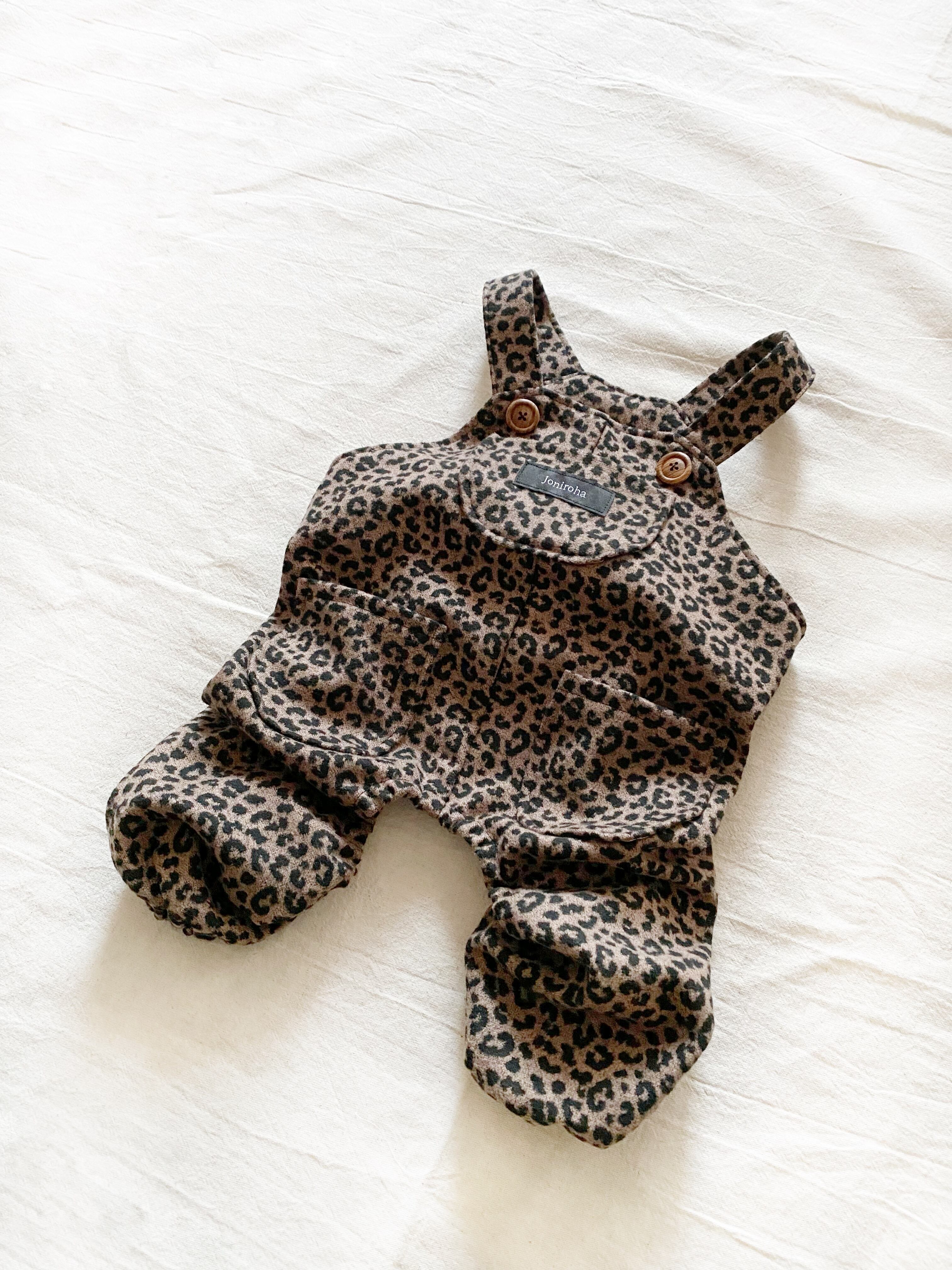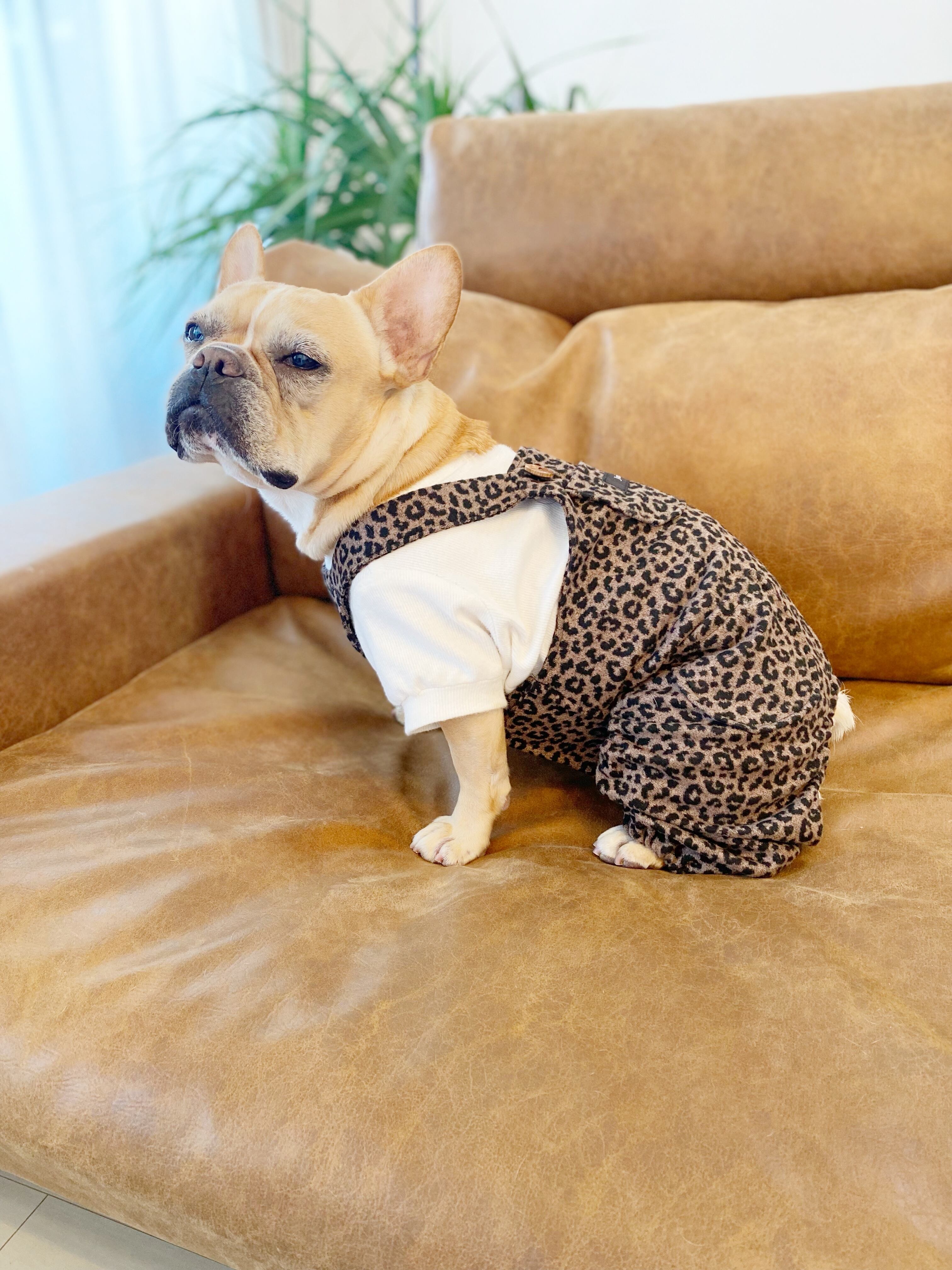 とってもお洒落なレオパードオーバーオール❤️ 犬服 犬服ハンドメイド サロペット 起毛 ヒョウ柄 フレンチブルドッグ服 フレブル服 パグ服 小型犬服 誕生日プレゼント