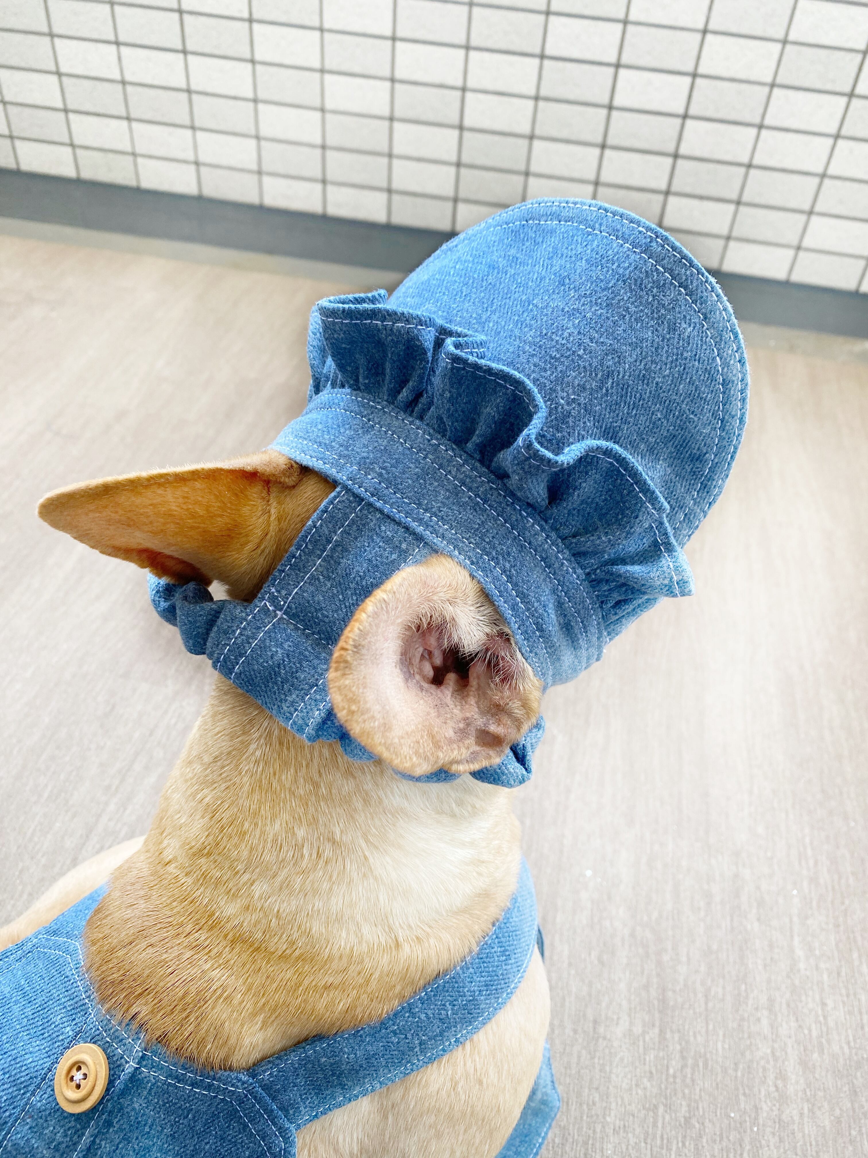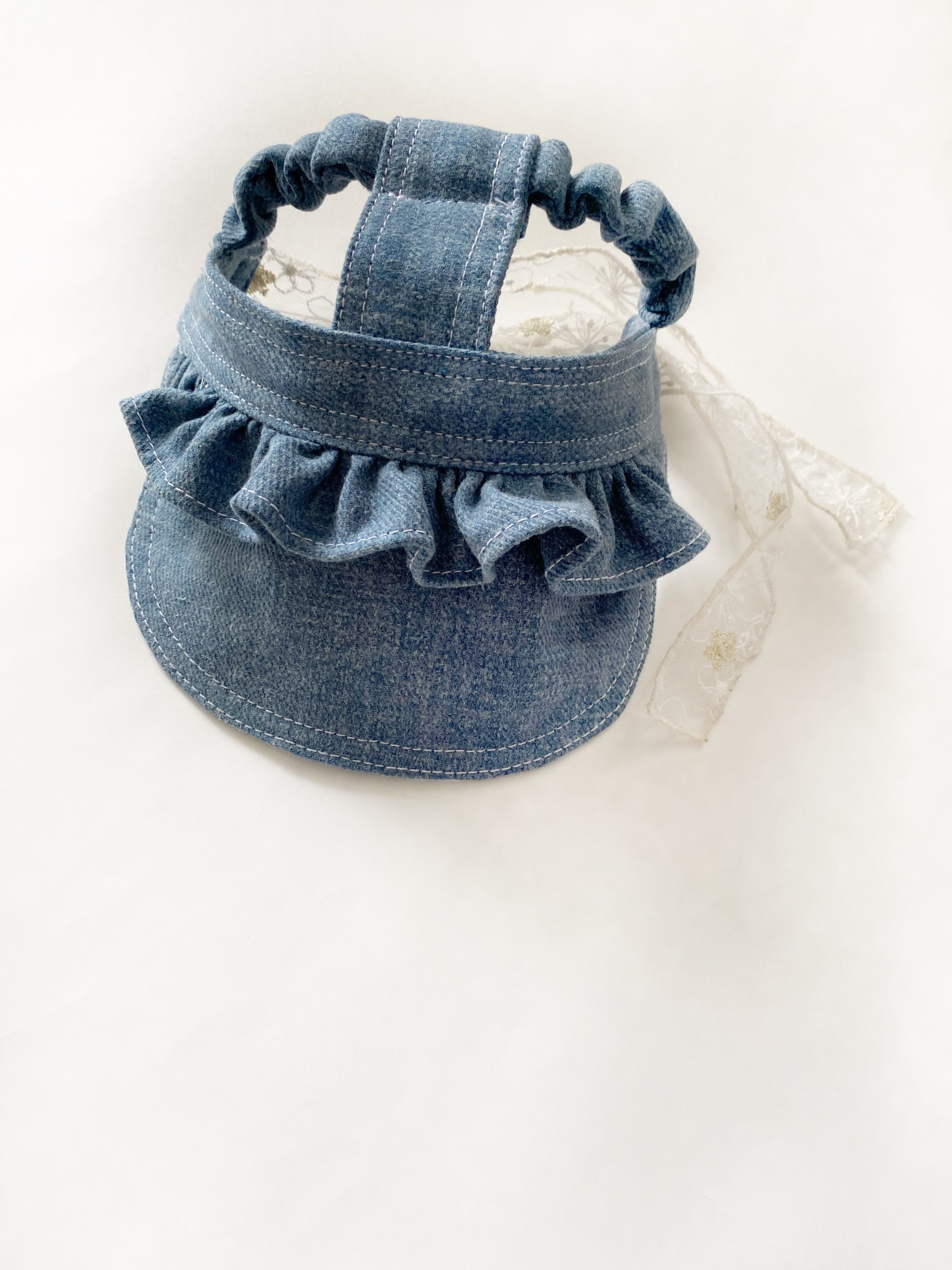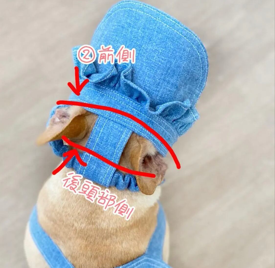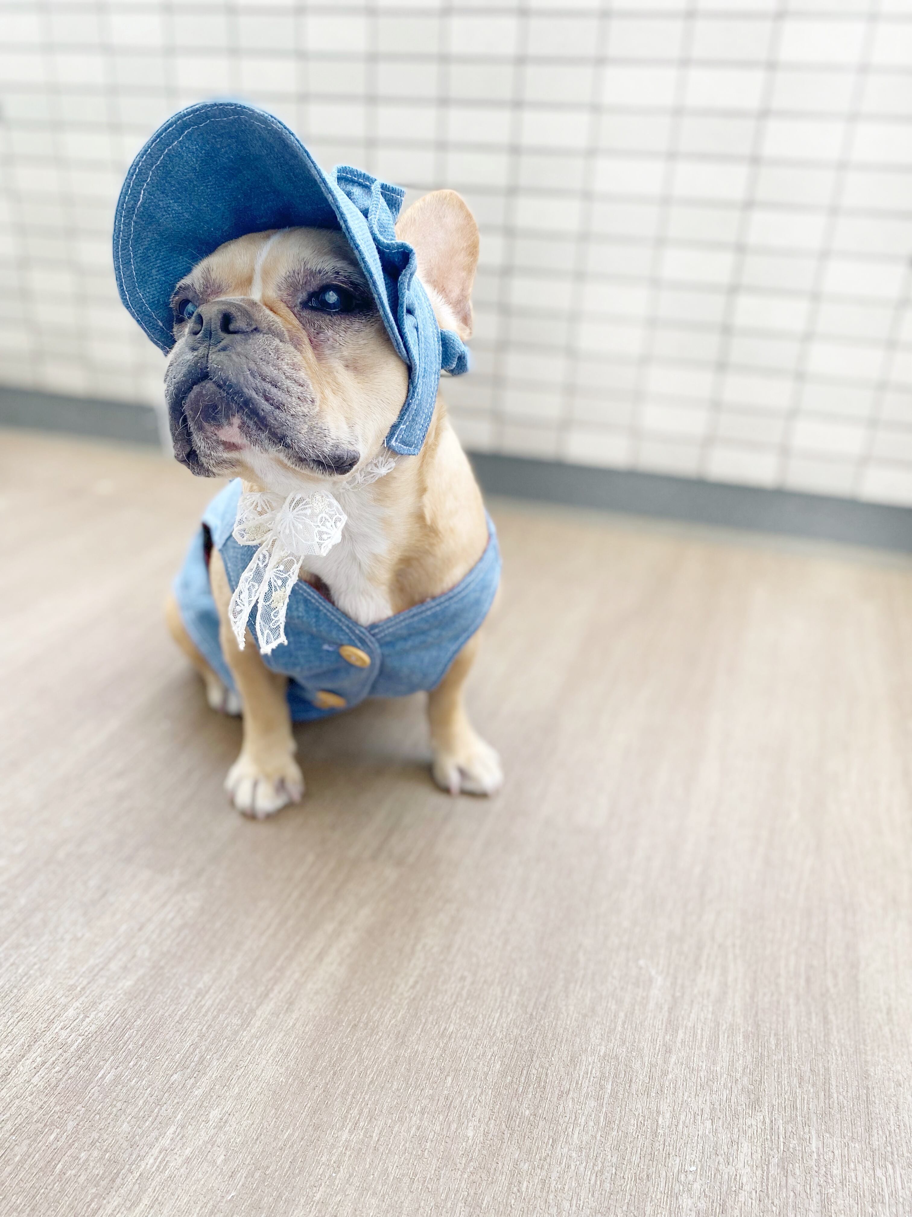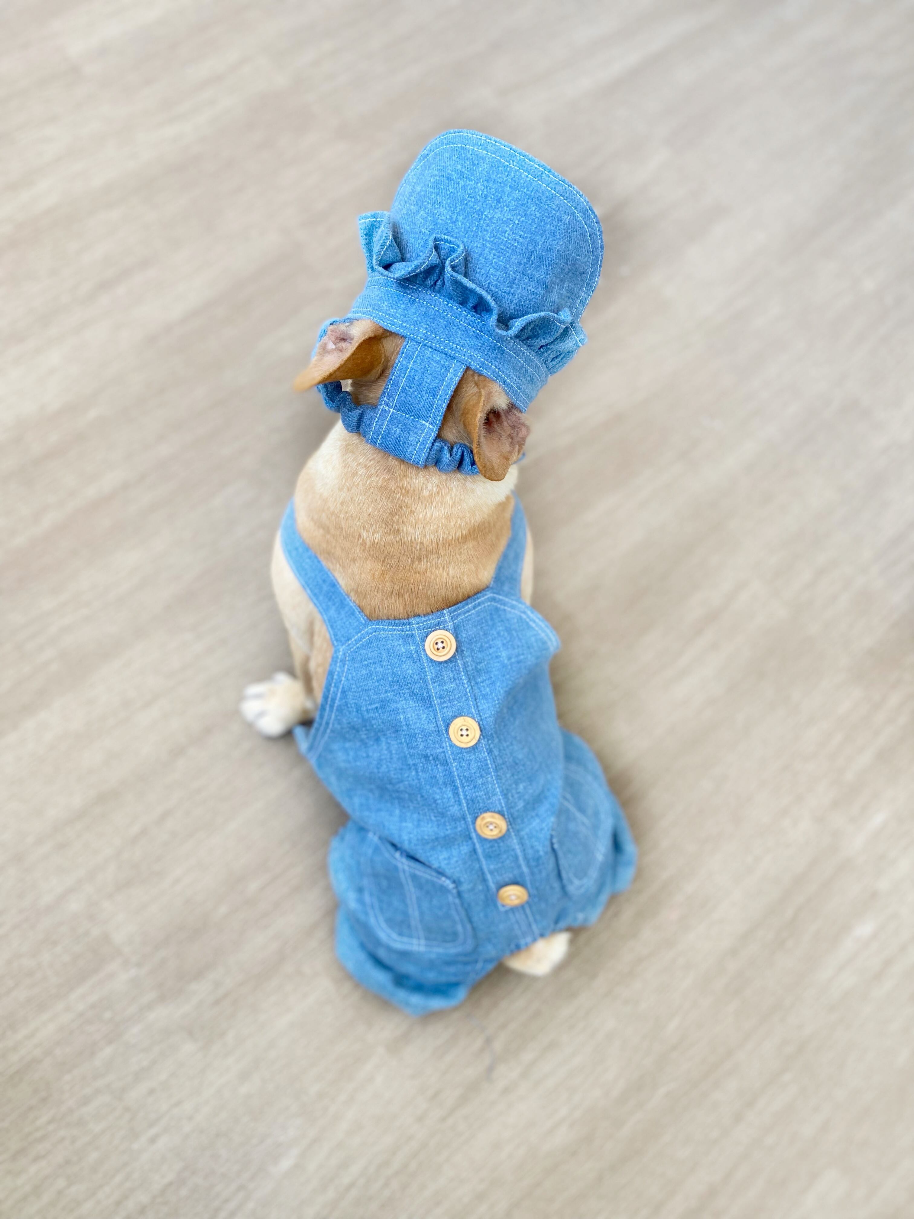 ふりふりがついたデニムのお帽子❤️ ストッパーあり 犬服 犬服ハンドメイド 見えないお洒落 フレンチブルドッグ服 パグ服 小型犬服 プレゼント