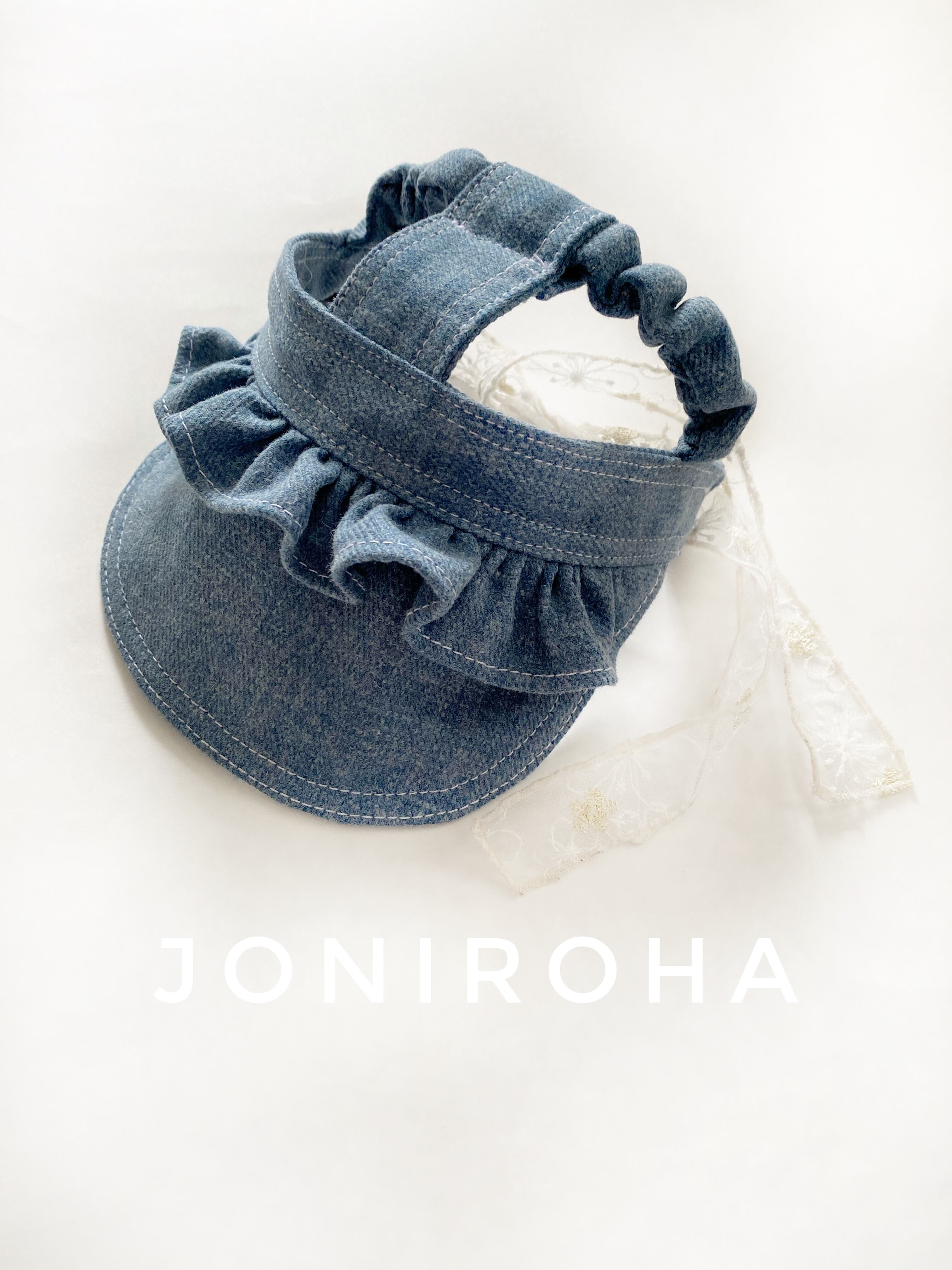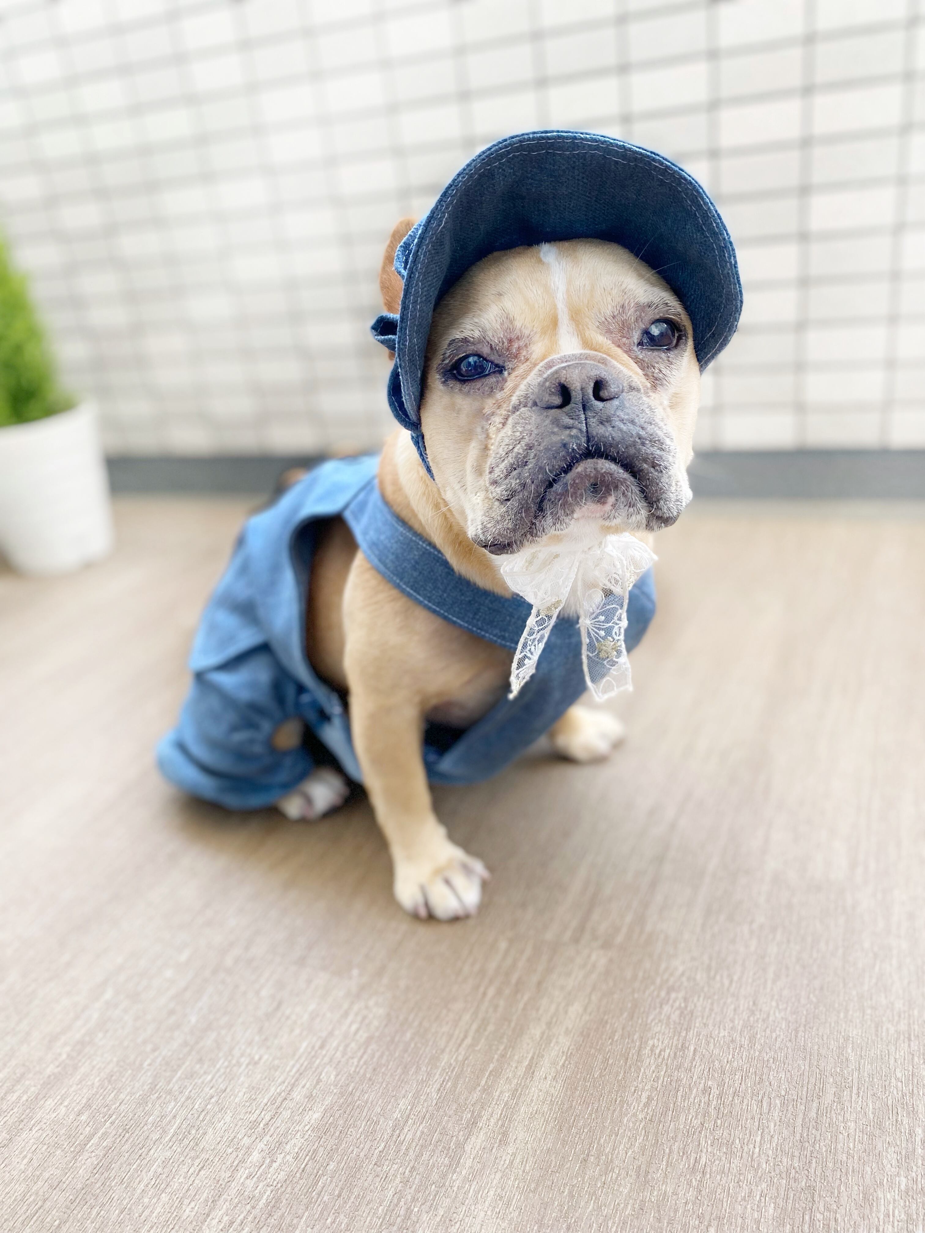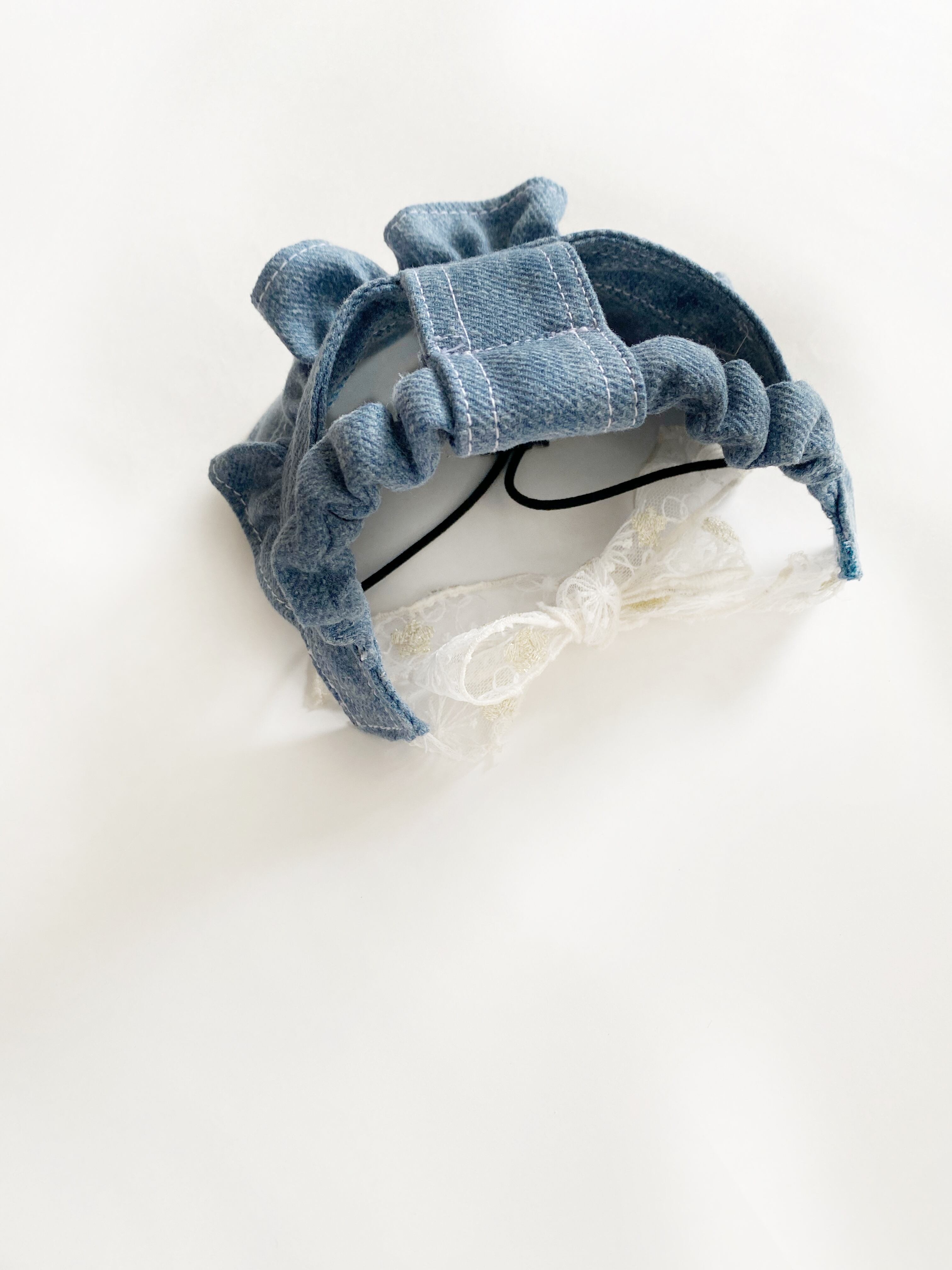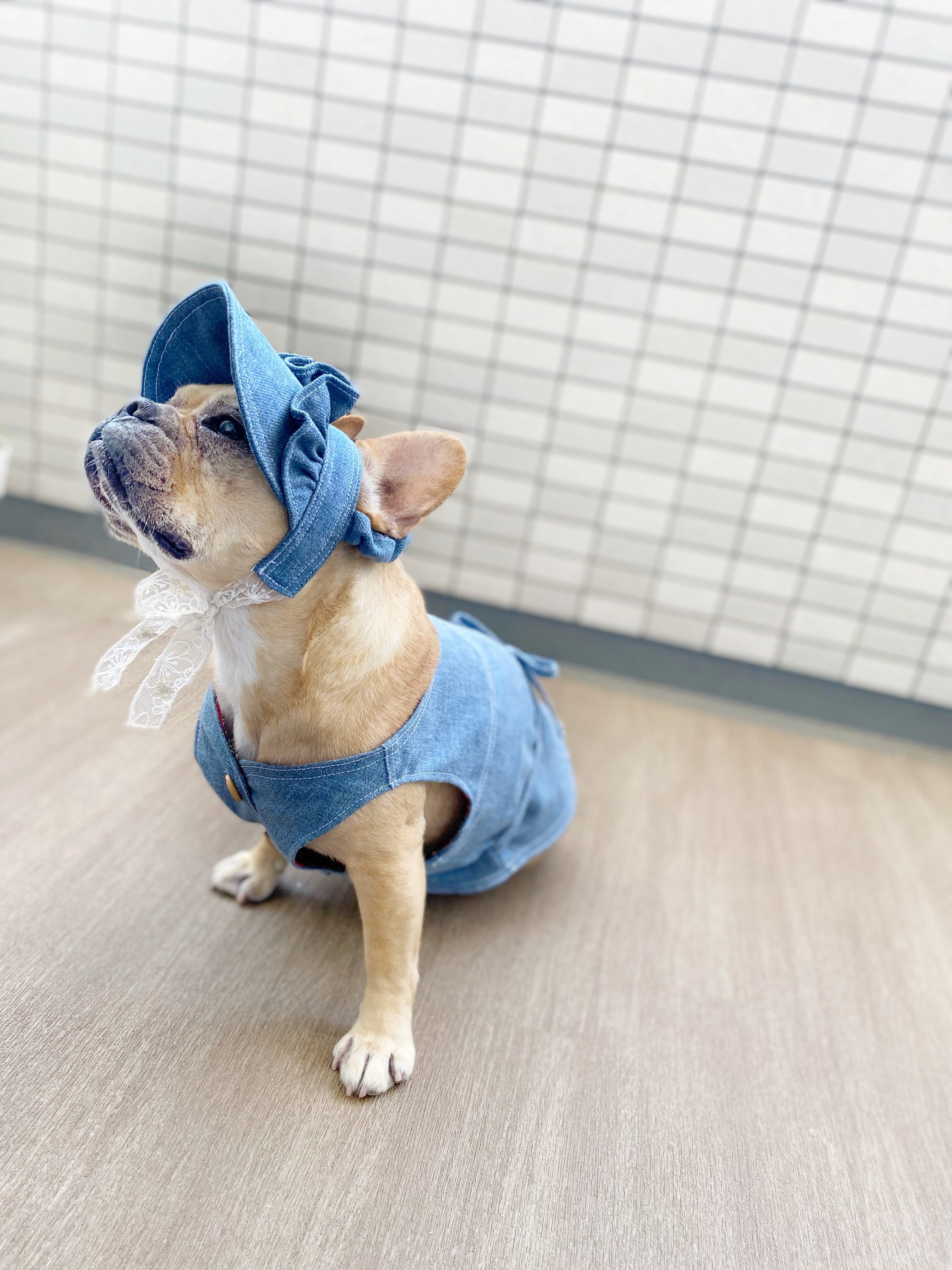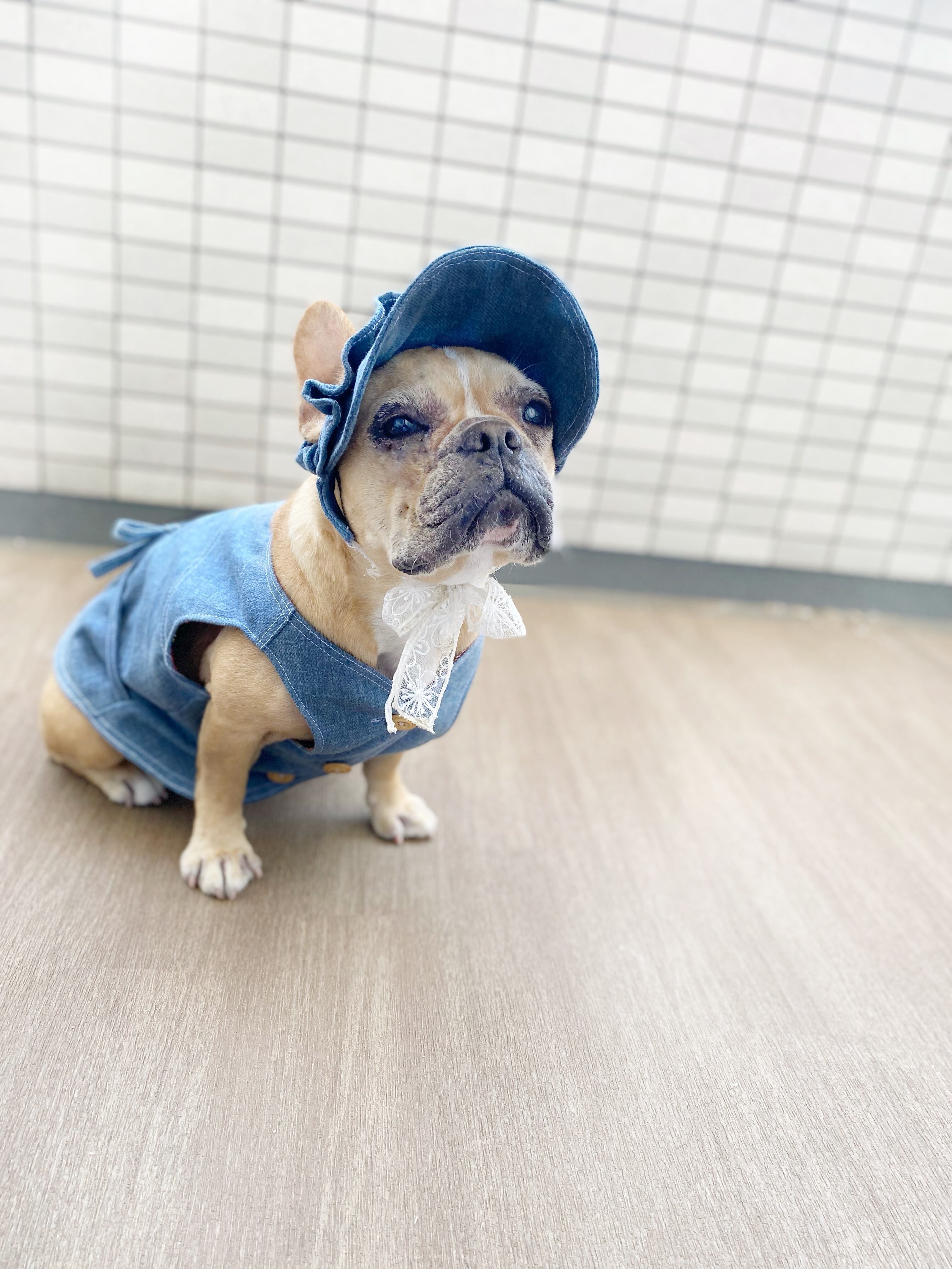 ふりふりがついたデニムのお帽子❤️ ストッパーあり 犬服 犬服ハンドメイド 見えないお洒落 フレンチブルドッグ服 パグ服 小型犬服 プレゼント