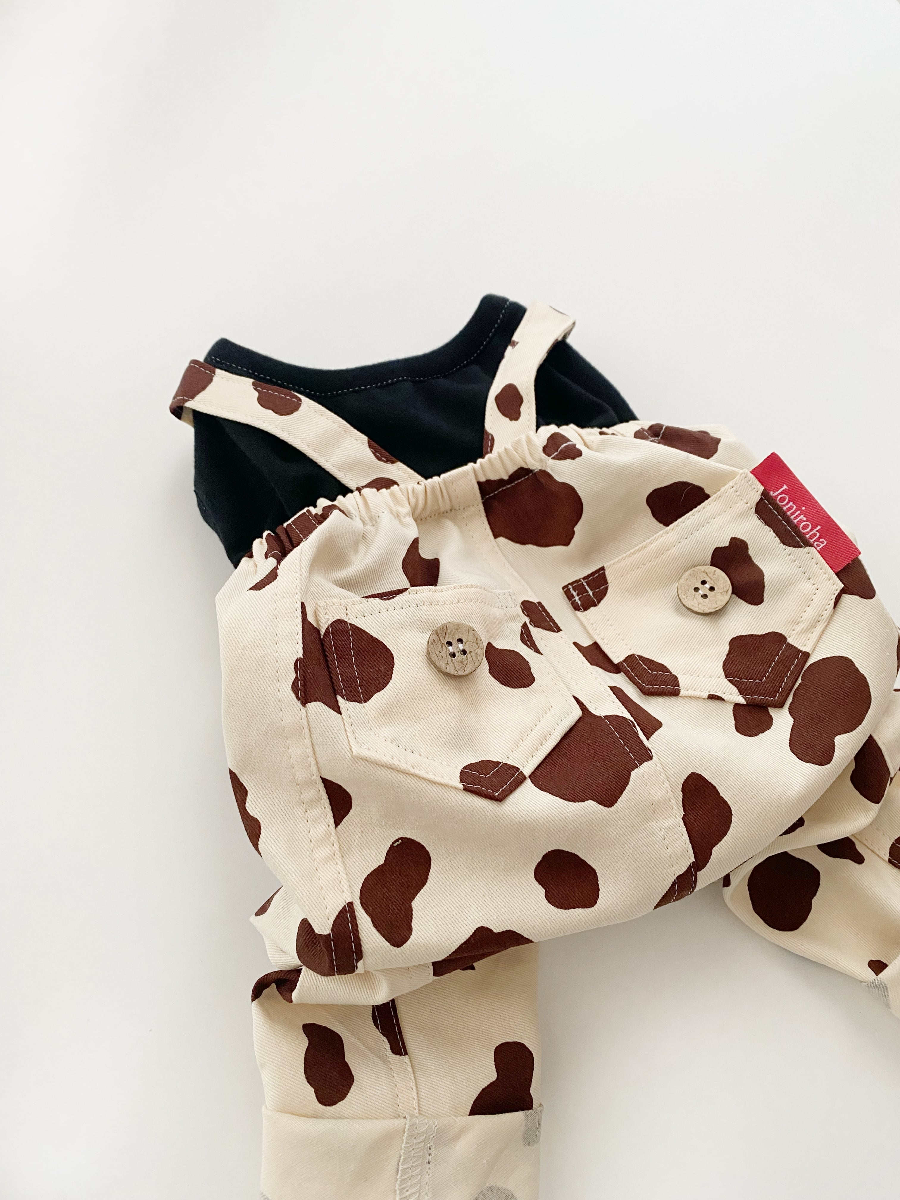 大人気のウシさん柄で、とっても可愛い✨重ね着風サロペットパンツが仕上がりました
