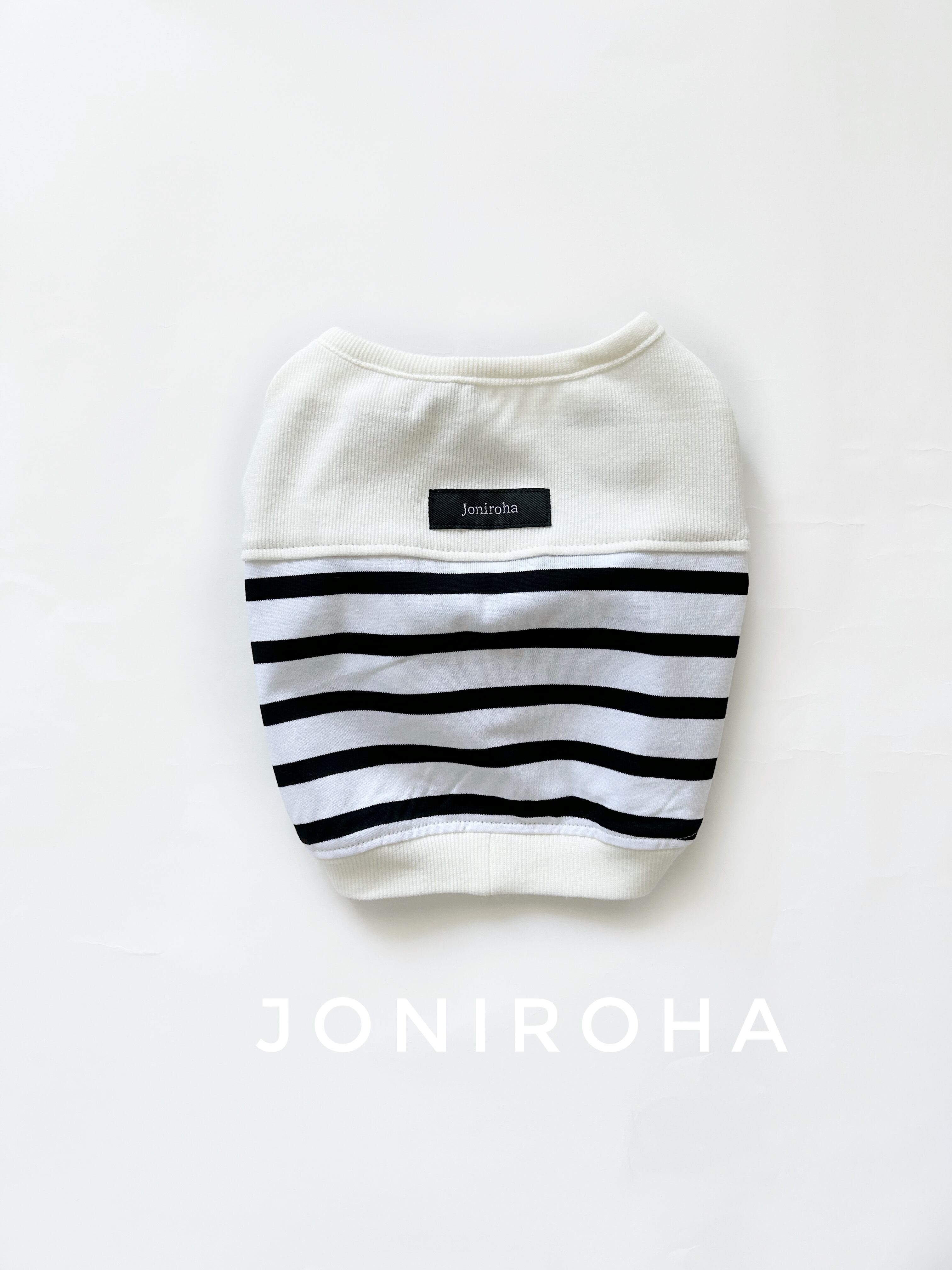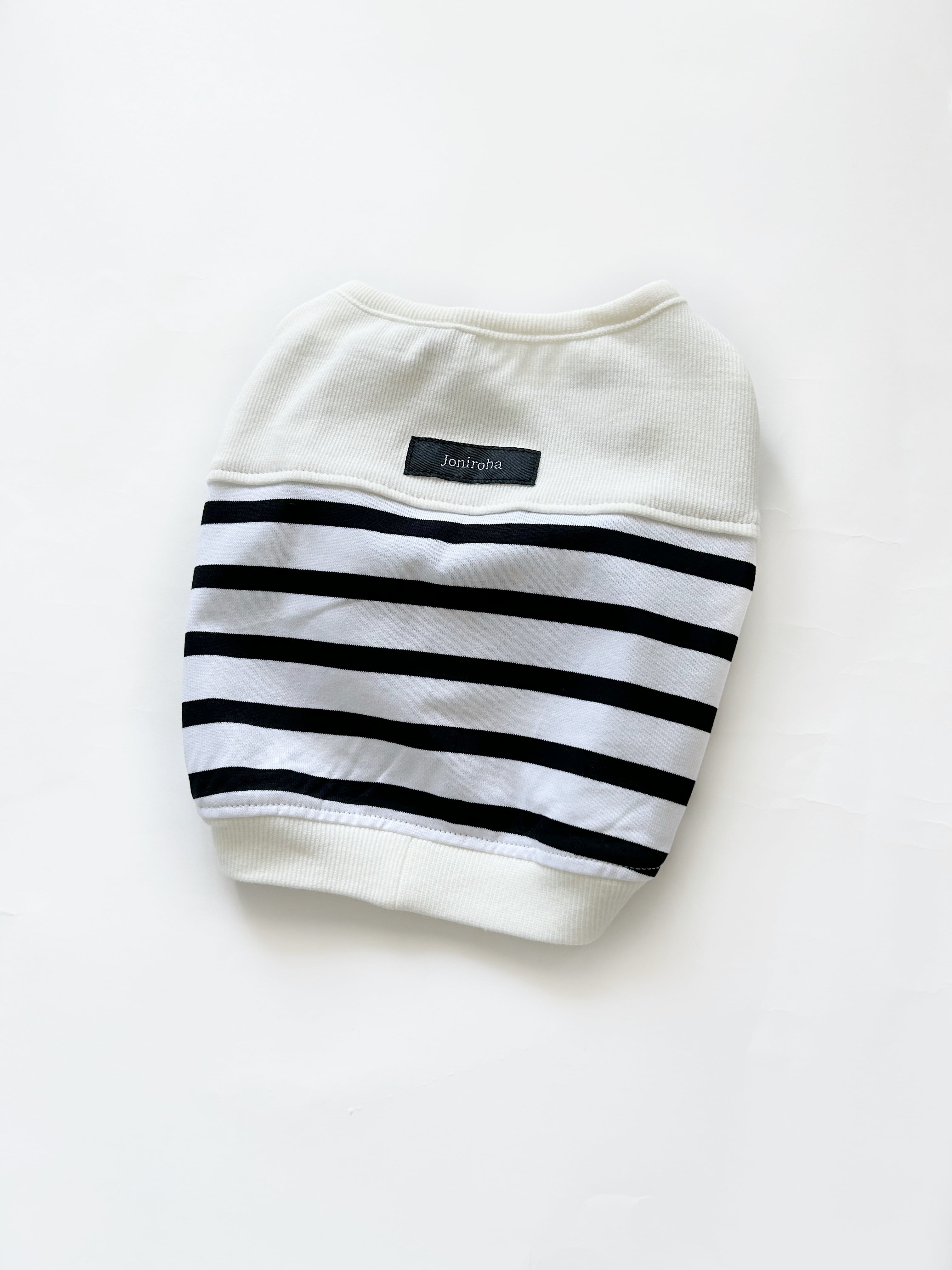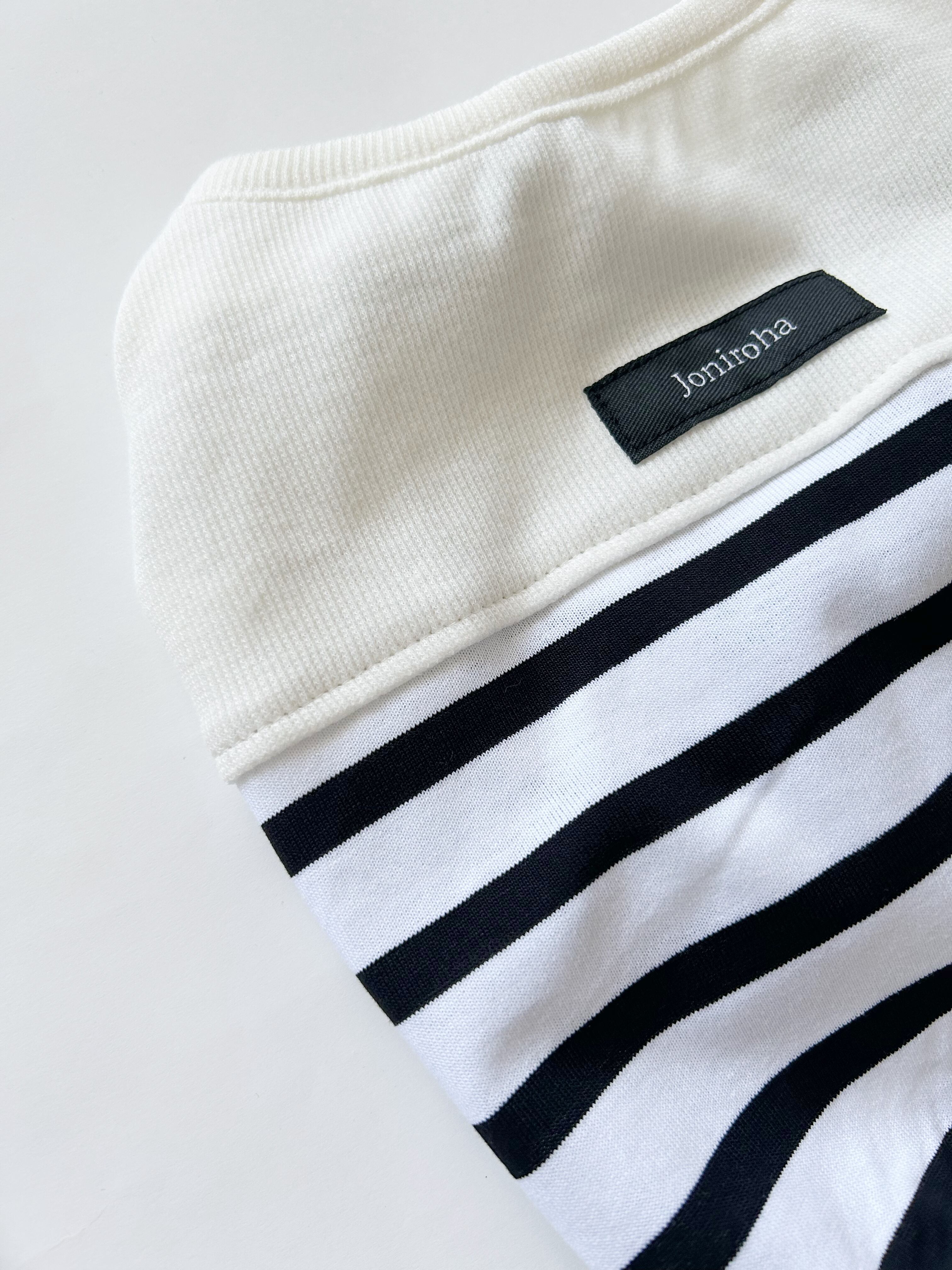 伸縮性のある首元に、密度の高いしっかりとした天竺ボーダーニットです。