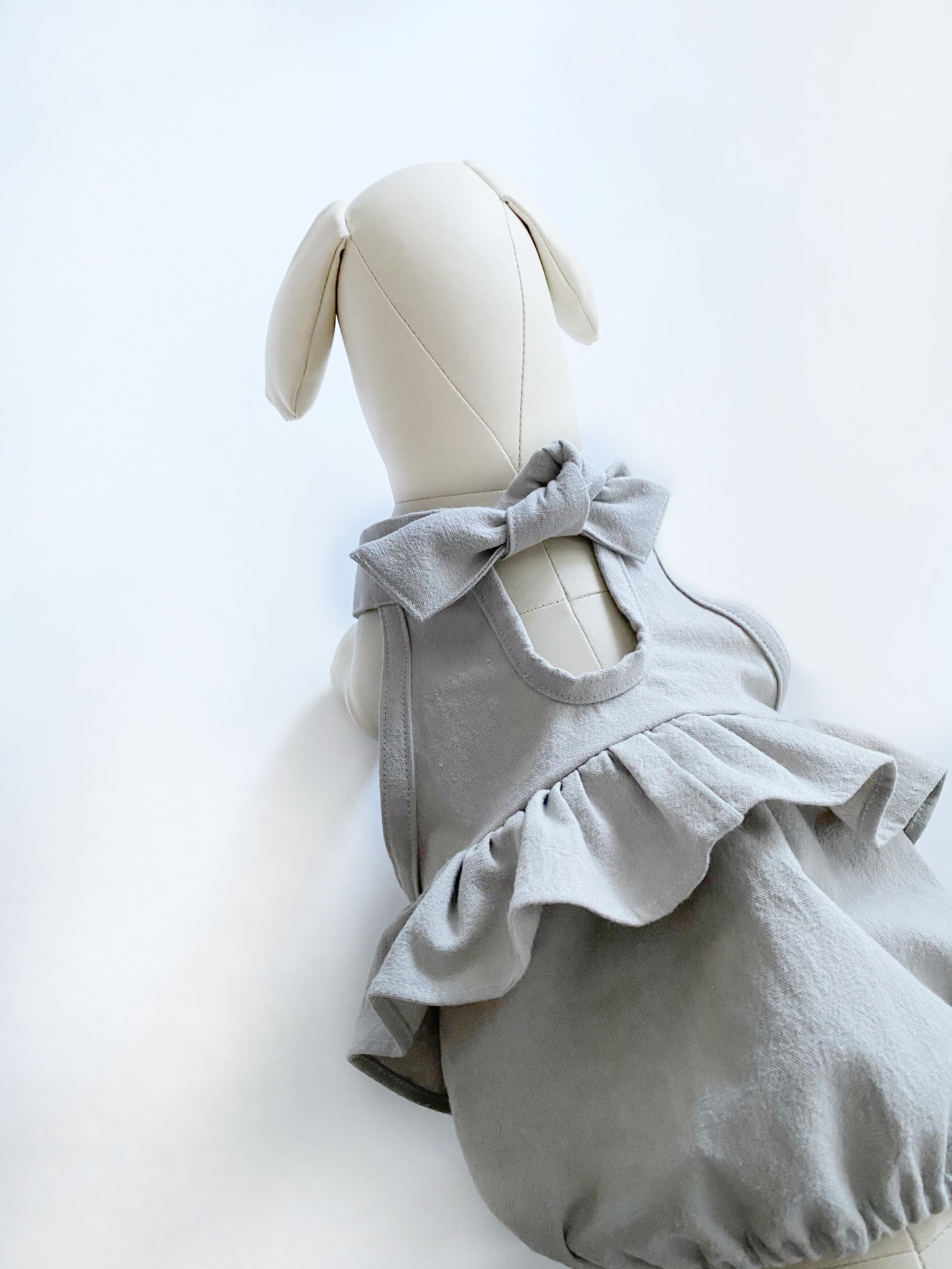 生地自体に伸縮性はありませんが、胴回りにゴムが入っており、お首はリボンにて多少の調整をして頂けます。